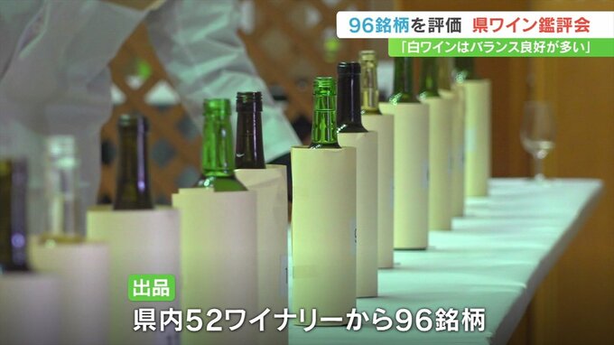 今年は県内52のワイナリーから赤や白、それに皮や種を一緒に仕込むオレンジワインなど合わせて96点が出品されました。