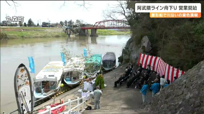 屋形船に乗りながら阿武隈川沿いの景色を楽しむことができます。宮城県丸森町の阿武隈ライン舟下りの営業が11日から始まり、関係者が今シーズンの安全を祈願しました。