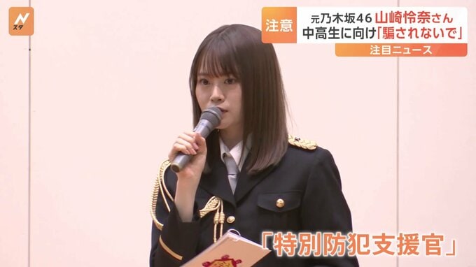 元乃木坂46 山崎怜奈さん「楽して稼げるバイトなんて、基本的に存在しない。甘い言葉に騙されないようにしていただきたい」きょう、東京・昭島市の中高一貫校で行われた防犯イベントに「特別防犯支援官」で元乃木…