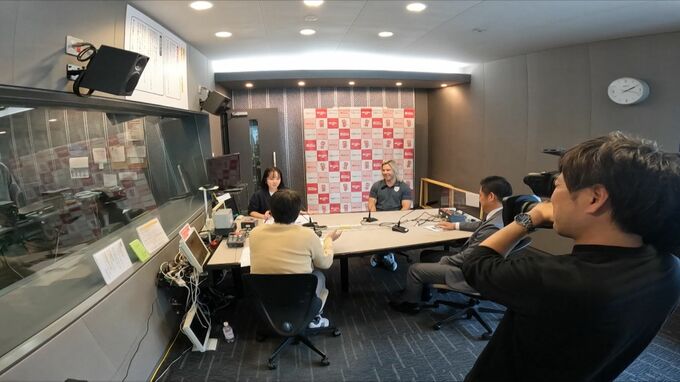 11日、OBSラジオの生放送番組に出演した横浜キヤノンイーグルスのファフ・デクラーク選手。南アフリカ代表として去年のラグビーW杯で2連覇に貢献した世界最高峰のスクラムハーフです。1月の試合でけがをして療養中ですが、身長170センチという小柄な体格に似合わないアグレッシブなプレースタイルでチームを引っ張っています。