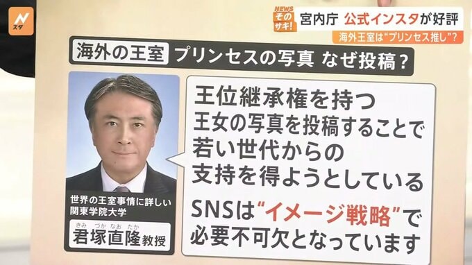 世界の王室事情に詳しい関東学院大学の君塚直隆教授は「王位継承権を持つ王女の写真を投稿することで、若い世代からの支持を得ようとしている。SNSは“イメージ戦略”で必要不可欠となっています」と話しています。