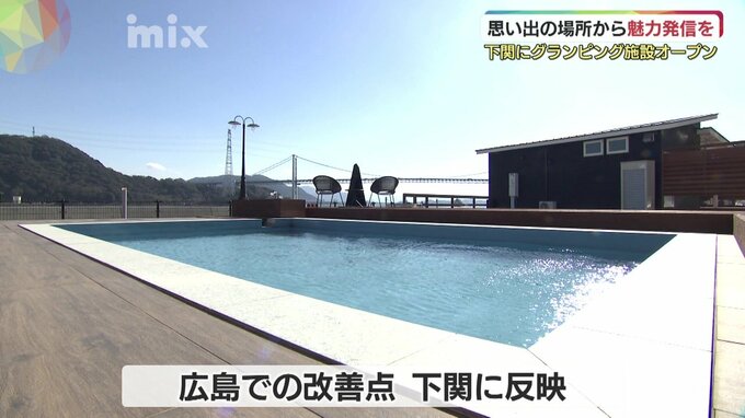 高校時代、目にしていた景色でもあり、思い入れのある場所です。契約後、すぐに着工。去年12月に完成しました。海峡を見ながら入れるお風呂、犬と泊まれるドッグラン付きの部屋、そして、プール・・・。広島の施設での改善点を下関に反映させました。