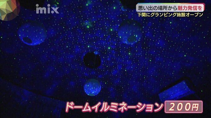 夜ならではの楽しみも。テント内の「ドームイルミネーション」は、天候に左右されずに楽しめると好評だそうです。お風呂は照明を消すと窓から夜景をじっくり眺められます。