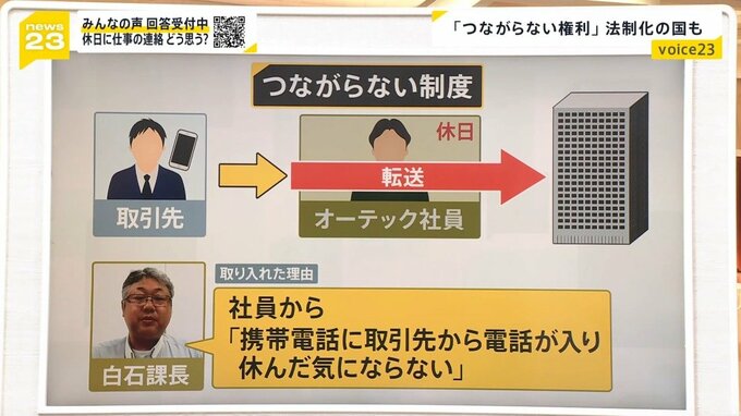 設備工事会社「オーテック」の取り組みでは、たとえば平日に休みを取っている社員のもとに取引先から電話が入ってきた場合に、本人ではなくて会社に自動転送されるそうです。出社している他の社員が対応するようにしていると。