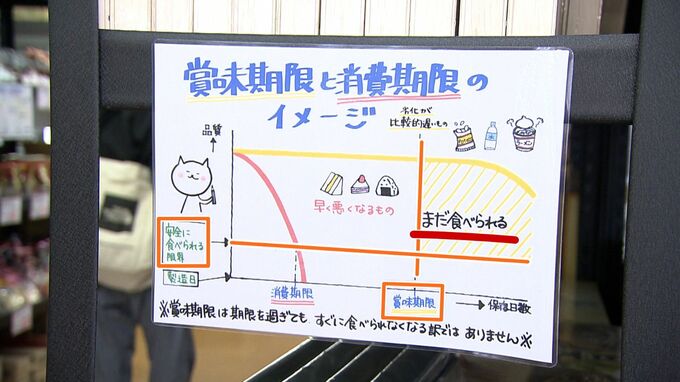 「当店にお客さんが来られた時点で、当店に並べている商品を見て『すでにこれだけ食品ロスがある』というのを目の当たりにしてもらうことと、当店のスタッフが賞味期限や消費期限の知識を深めているので、このような説明を通じてSDGsの4番の目標に当たる『質の高い教育』をさせて頂いております」)