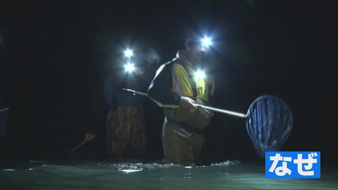 ことしは当たり年、記録的な豊漁となっている富山県のホタルイカ。浅瀬に大量に現れる“爆湧き”を求めて、富山市の海岸には全国からタモをもった“ハンター”たちが殺到しています。取材をしたのは木曜夜から金曜明け方にかけて。平日にも関わらず大勢の人たちでにぎわっていました。それもそのはず、この日は“爆湧き”の条件がそろっていたのです。記者もタモにヘッドライトをつけて臨みました。