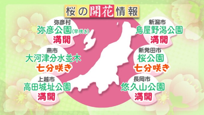 新発田市の桜公園や、燕市の大河津分水は「七分咲き」となっています。