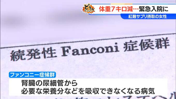 診断は「ファンコニー症候群」。腎臓の尿細管から必要な栄養分などを吸収できなくなる病気で、日本腎臓学会の調査でも、小林製薬のサプリを飲んで健康被害を訴えた人の大半が、同じ診断を受けています。