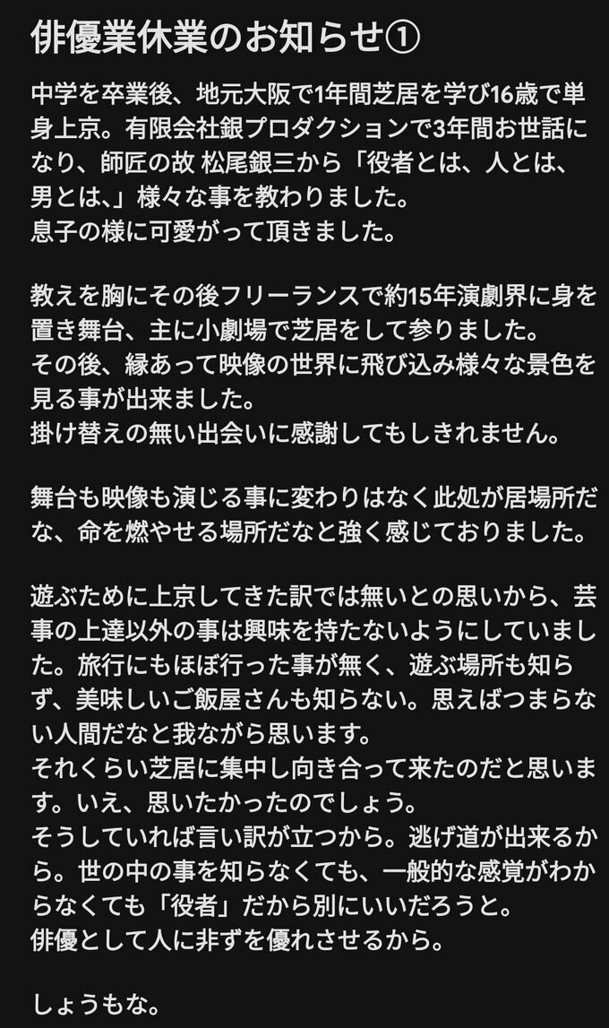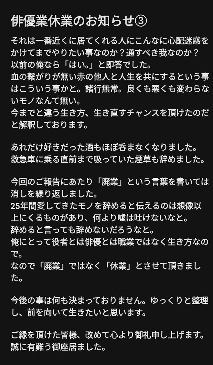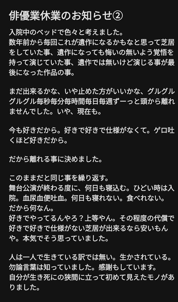 そして、「まだ出来るかな、いや止めた方がいいかな、グルグルグルグル毎秒毎分毎時間毎日毎週ずーっと頭から離れませんでした。いや、現在も。」「今も好きだから。好きで好きで仕様がなくて。ゲロ吐くほど好きだから。」「だから離れる事に決めました。」と、俳優業に対しての胸の内を告白。