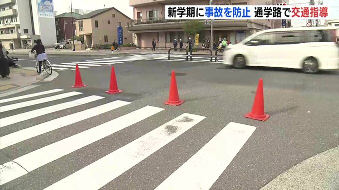 続々と登校してくる児童たちに警察官が声をかけていました。また、交通違反を未然に防ぐため、時間帯によって車が通行できなくなる場所には、事前にコーンが設置されていました。
