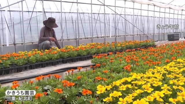 三重県紀北町で、黄色やオレンジなど色とりどりの鮮やかな花「マリーゴールド」が、出荷のピークを迎えています。