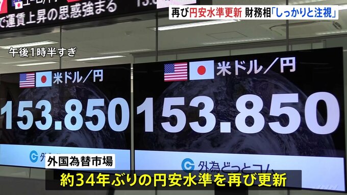 円安が止まらず、再び、およそ34年ぶりの円安水準を更新しました。きょうの東京外国為替市場で、円相場は1ドル=153円80銭台をつけ、1990年6月以来、およそ34年ぶりの円安水準を再び更新しました。イランによる攻…