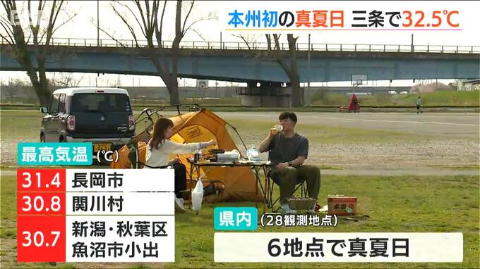 15日の新潟県内は、28の観測地点のうち25の地点で今年の最高気温を記録しました。このうち三条市では32.2℃・長岡市で30.9℃など、6つの地点で4月の観測史上最高を記録。1日の最高気温が30℃を超える真夏日となったところも6か所ありました。