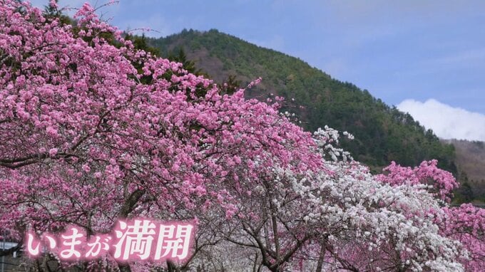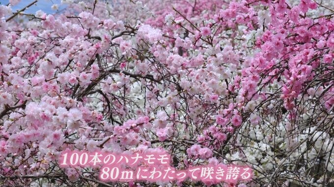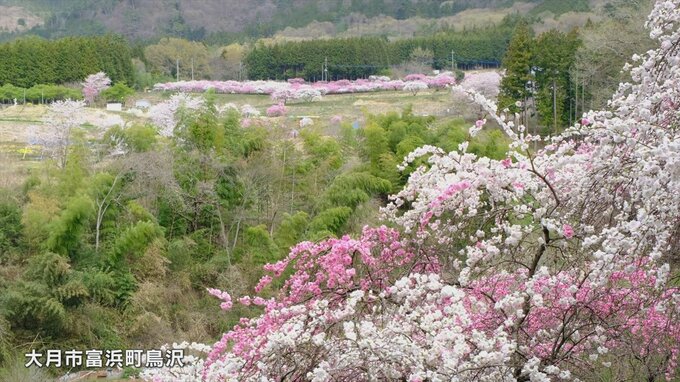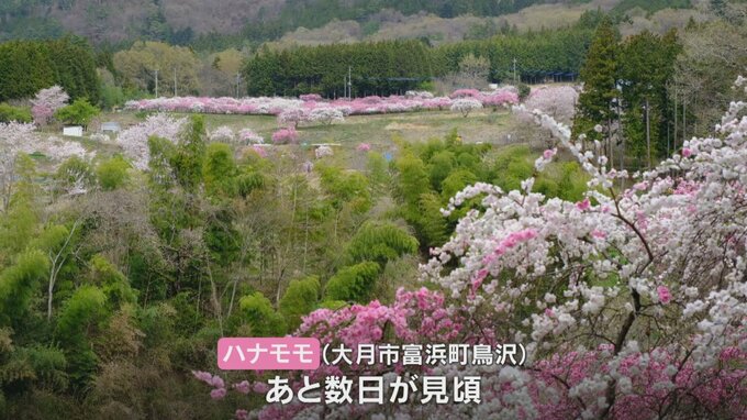 山梨県大月市の山里で、100本のハナモモが満開となっています。
