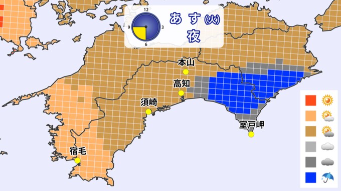 天気を時間ごとに見ると、午前中は平野部で雨となる見込みです。午後になると中部から東部で雨雲が発生し、雷雨となるおそれがあります。雷や竜巻などの激しい突風、ひょうに注意してください。