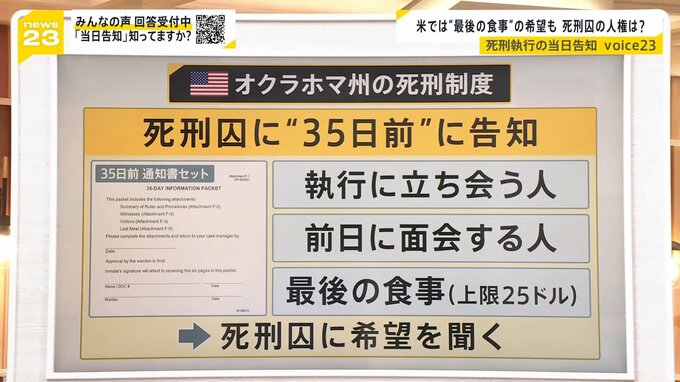 この死刑執行の手続きについては各国で違いがあります。日本と同じように死刑制度のあるアメリカ・オクラホマ州の例を見ていきますと、死刑囚には35日前に告知をするということになっていて、その中で執行に立ち会う人、前日に面会する人、さらに最後の食事などを死刑囚に希望として聞くようになっているそうなんです。