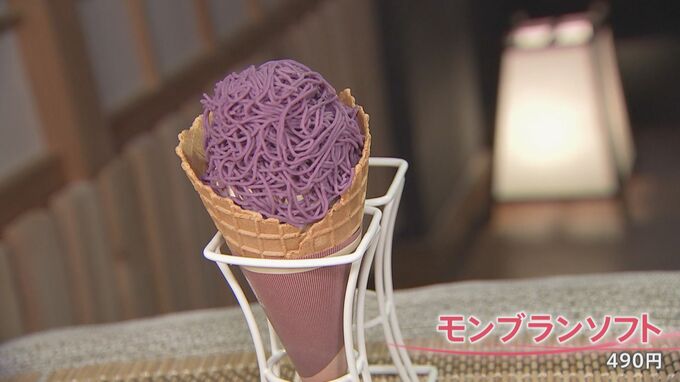なかでも、暑い日に人気だというのが、冷たいバニラアイスにさつまいもペーストをまとわせた「モンブランソフト」(490円)。ペーストを1.2ミリと細くすることで、さつまいもの風味が存分に楽しめるそうです。