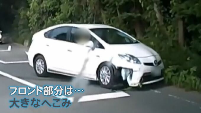 曲がりきれなかったのか、大きくはみ出し、ガードレールに衝突。その直後、車は動き出し自分の車線へ。フロント部分は大きくへこんでいるのがわかります。このドライブレコーダーの持ち主によると、運転していた男性にケガをしている様子はなかったといいます。