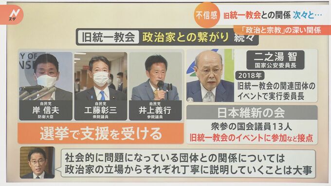また、二之湯智国家公安委員長も2018年、旧統一教会の関連団体のイベントで実行委員長になりました。また日本維新の会でも、衆参の国会議員62人中13人が旧統一教会のイベントに参加など接点があったということです。