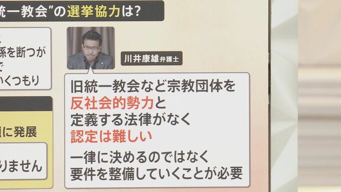 川井弁護士は、旧統一教会など宗教団体を反社会的勢力と定義する法律がなく、認定は難しい。いわゆる暴対法などでは反社会的勢力だと認定する根拠があるが、(宗教団体については)その法律的根拠が日本にはない。ですから一律に反社会的勢力などと決めるのではなくて、1つ1つの個別の状況を見ていって、要件を段階的に整備することが必要だと話しています。