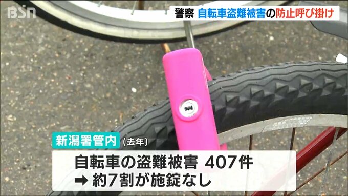警察によりますと、新潟駅の駐輪場をはじめ新潟署管内では、去年自転車が盗まれる被害が407件確認されていますが、このうち7割近くが鍵がかかっていなかったということです。