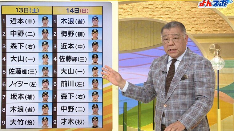 「連覇できません。仮に僕が相手のチームの監督だとすれば、阪神打線の中で一番嫌なところはどこかと言えば、1番・近本、2番・中野の1・2番なんですよ。この1・2番のバランスを崩してくれるってことは、バッテリーがやっぱりすごく楽なんです。1番で木浪が出塁しても、そんなに足が速くありませんので、仕掛けられないですよね。だからピッチャーがバッターに集中して勝負ができるランナーが1塁にいても、相手のバッテリーにプレッシャーが与えられないじゃないですか。近本・中野の1・2番は崩してはいけない打順だと思います。それともう1つ、4番に入った佐藤が14日のゲームでホームランでも打っていれば、『この打順では連覇ができない』というコメントはありませんでしたけれども、岡田監督になって初めて佐藤は4番を打った。去年、優勝を決めたときに大山は膝を崩して泣き崩れましたよね。あの4番のプレッシャーというものを佐藤は近くで見ているわけですから、自分が初めて、日本一になった翌年、岡田監督になって初めて4番を任される、これはもっと重たいものを背負って打席に立つ、そういう姿を感じさせなきゃいけないんですよ。打てなくても構わないんですが、14日の佐藤の4打席は、そういうチームの勝敗を背負う4番としての雰囲気が全くなかったんですね。そう考えると、14日の打順では僕は連覇はないと思いますので、16日の巨人戦から僕は13日の打順に戻すべきだと思います」