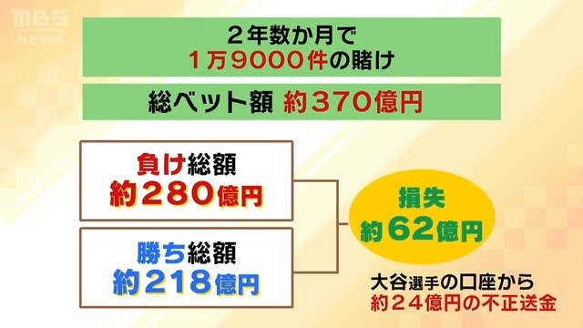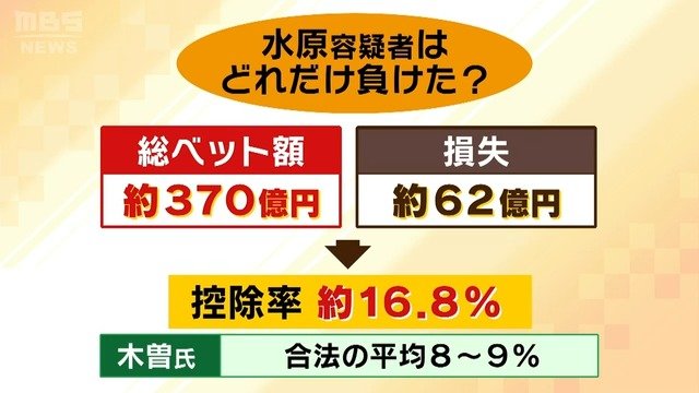 ――水原容疑者の年収は一説では4000万円とか7000万円とか言われています。2年数ヶ月でやっていた総額は370億円、賭けに使っていたそうです。負けは280億円、勝ちは218億円、その差額62億円がマイナスです。負けてる割合が16.8%、これは合法ギャンブル業者でしたら、こんなに高いわけないと。