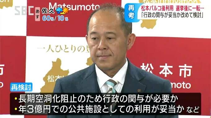 2025年2月末で閉店する松本パルコの後利用について、松本市は、施設を賃借する方針でしたが、臥雲市長は16日、行政が関与するかどうかも含めて改めて対応を検討することを明らかにしました。松本市 臥雲義…