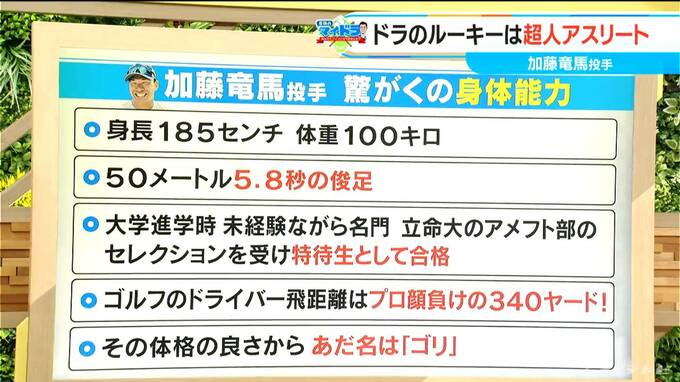 さらに、加藤投手について、もう1枚プロフィールご紹介しましょう。スペックがすごいんです。