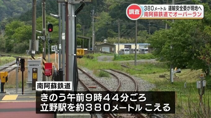 国土交通省によりますときのう、午前9時44分ごろ乗り入れているJR豊肥線(ほうひせん)で肥後大津(ひごおおづ)駅発の列車が立野(たての)駅で停車できず、380メートル超えて止まりました。乗客と乗員、合わせて約20人にけがはありませんでした。