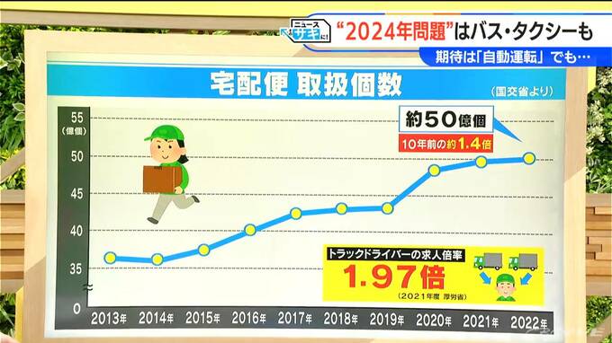 一方で心配なのが人手不足で、働きたい人1人に対して、どのくらい募集があるかを示す「有効求人倍率」は、トラックドライバーの場合は1.97倍。