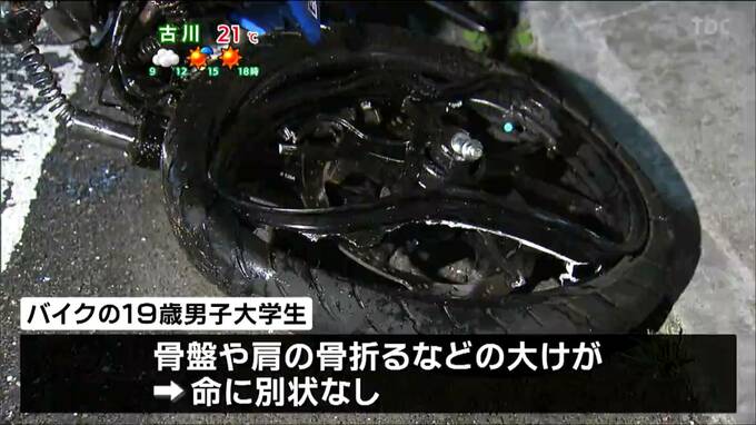 この事故で、バイクに乗っていた19歳の男子大学生が骨盤や肩の骨を折るなどの大けがをしましたが、命に別状はないということです。警察は乗用車を運転していた名取市の30代の男を過失運転傷害の疑いで現行犯逮捕しました。男は「間違いない」と容疑を認めているということです。