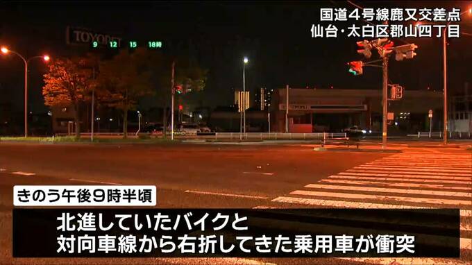 4月16日午後9時半頃、仙台市太白区郡山4丁目の鹿又交差点で、国道4号線を北進していたバイクと対向車線から右折してきた乗用車が衝突しました。