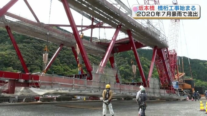 2020年7月の豪雨で流失し、復旧が進む八代市坂本町(さかもとまち)の坂本橋に新しい橋桁を架ける工事が始まりました。大阪から運び込まれた巨大なクレーンに吊るされているのは、新たに設置される橋桁です。長33…