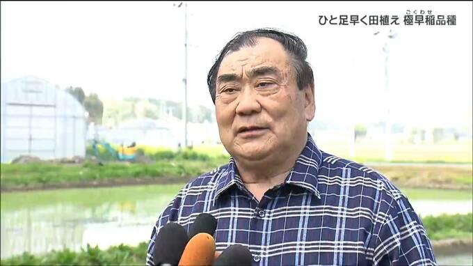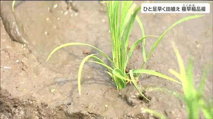 17日、田植えが行われたのは、宮城県涌谷町吉住のコメ農家、黒澤重雄さんの田んぼです。およそ40アールに15センチほどに育った苗を機械で植えていきました。植えられた苗は、黒澤さんが25年ほど前から独自に栽培している極早稲(ごくわせ)品種のブランド米「おもてなし」です。ひとめぼれと比べて2週間から1か月ほど早く生育が進みます。黒澤さんによりますと、3月3日の種まき直後に気温の低い日が続いたものの、苗の生育は順調に進んだということです。