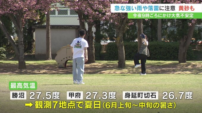 最高気温は勝沼で27.5度、甲府で27.3度などと観測10地点中7地点で、25度以上の夏日となり、各地で6月上旬から中旬の暑さとなりました。