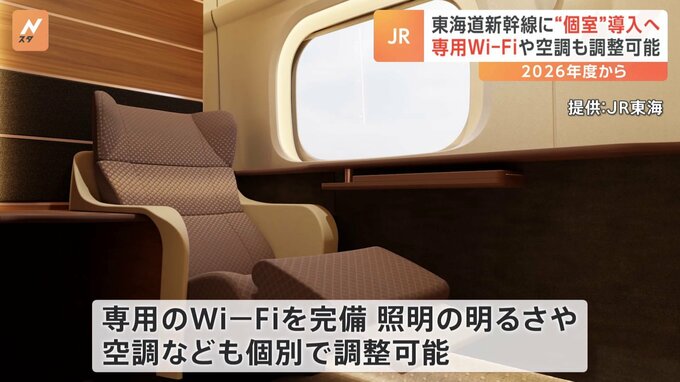 ゆったりとしたリクライニングシートが備えられた高級感あふれる部屋。これは、JR東海が2026年度から東海道新幹線に導入すると発表した個室タイプの座席のイメージ映像です。グリーン車よりも上質な設備とサービス…