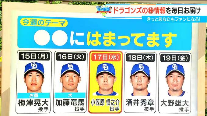 はい。今週のテーマはこちら、「○○にはまってます」ということで、梅津投手は「お香」にはまっていました。ルーキーの加藤竜馬投手は「犬」にはまっていました。