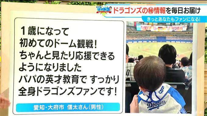 愛知県大府市にお住まいの、信太さんからいただきました。1歳になって初めてのドーム観戦、ちゃんと見たり応援できるようになりました。「パパの英才教育で、すっかり全身ドラゴンズファンです」ということで、いろいろなグッズも身に着けてますね。