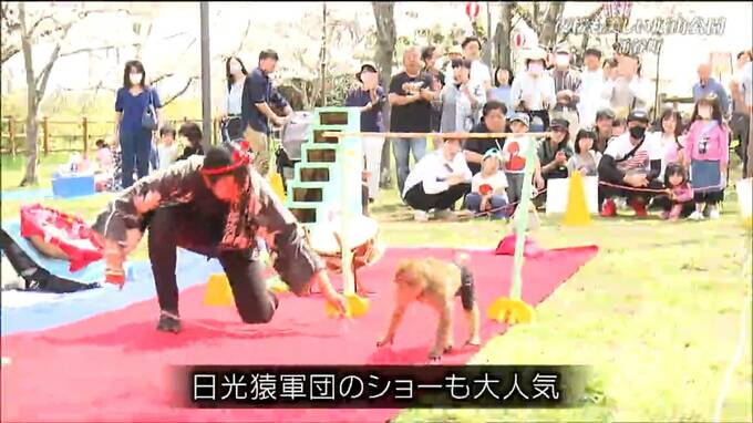 城山公園では、ソメイヨシノなど500本が咲き誇り「桜まつり」が行われています。今年は5日に開花し、10日に満開となりました。花見会場では、日光猿軍団のショーも人気を集めていました。