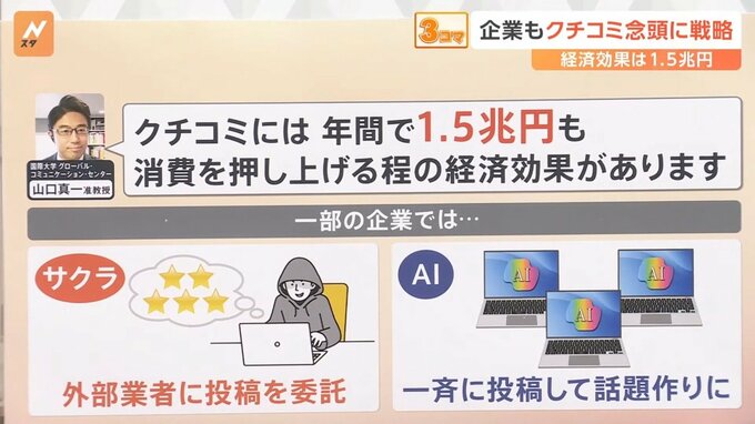 クチコミの影響力について、SNSなどに詳しい国際大学グローバルコミュニケーションセンターの山口真一准教授は、「クチコミには年間で1.5兆円も消費を押し上げる程の経済効果があります」と話しています。