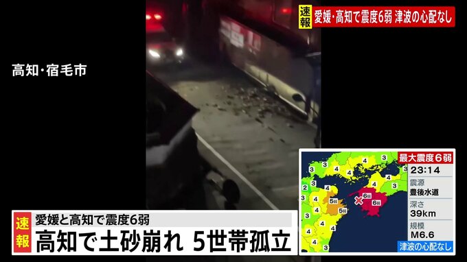 高知県の地元消防などによりますと、梼原町で落石と倒木により土砂崩れが起き、1車線しかない道路が土砂で埋もれ、通れなくなっているということです。これにより、あわせて5世帯10人が孤立していて、このうち3世…