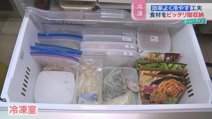冷凍庫は、冷蔵室と違い、隙間なくパンパンに詰め込むのがポイントです。冷えた食材がお互いに冷やし合うことで冷凍効率がアップ。節電にも繋がるので、10割収納を目指します。食材で埋められなかった場合は、保存容器などに氷を作り、空間を埋めてもOKです。