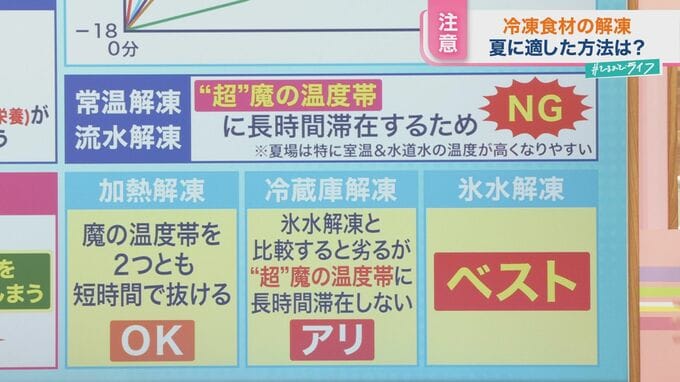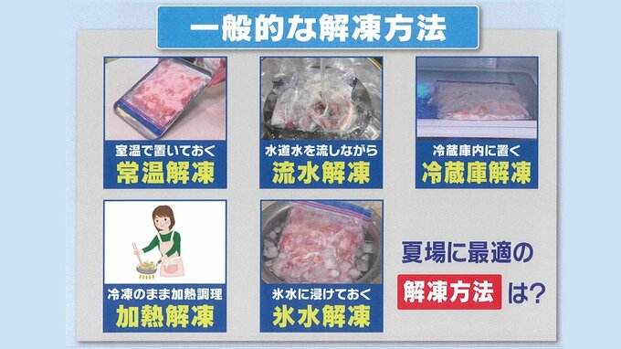 夏場は室温や水道水の温度が高くなりやすいので、「常温解凍」と「流水解凍」は避けてほしい、ということでした。