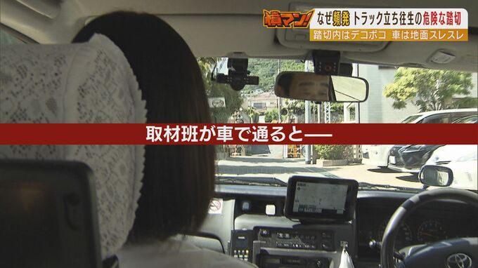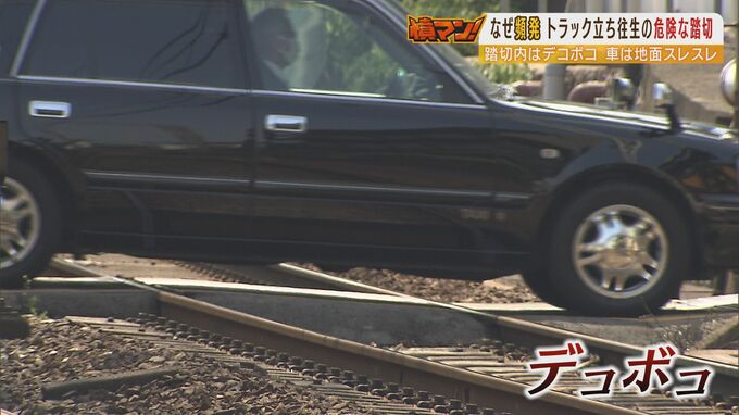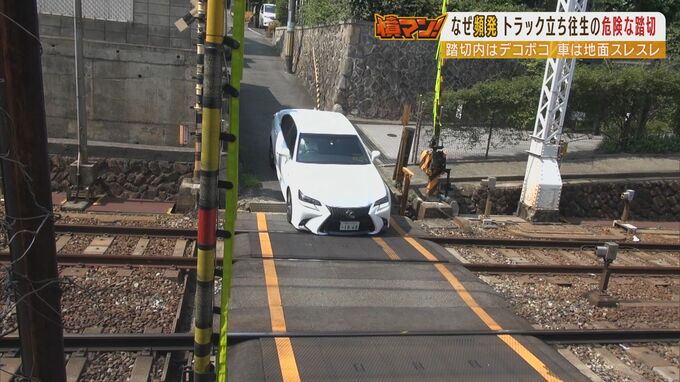 踏切付近の線路はカーブになっているため傾斜しています。そのため踏切内にはデコボコがあり、乗用車も底を擦りそうになりながら通過します。