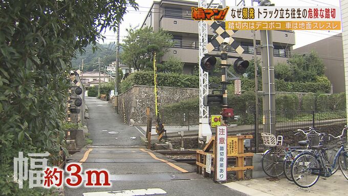 踏切に繋がる市道の幅は約3m。車がすれ違うことも困難な狭さです。