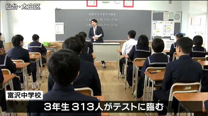 この調査は文部科学省が、全国の小学6年生と中学3年生を対象に行っていて、宮城県内ではおよそ560校、3万7000人の児童・生徒が対象です。このうち仙台市太白区の富沢中学校では3年生313人がテストに臨みました。
