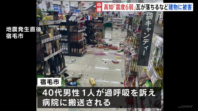 震度6弱を観測した宿毛市です。午前2時ごろから取材を続けていますが、明るくなるにつれて、建物の屋根の瓦がずれるなど、被害が明らかになってきました。高知県では宿毛市で震度6弱、四万十市、土佐清水市、梼原…