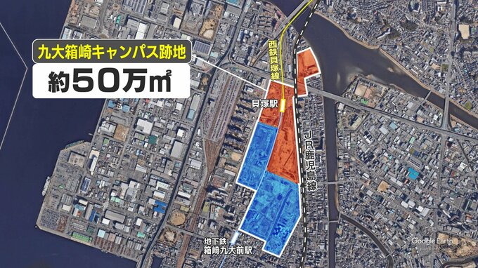 本田奈也花アナウンサー「福岡市東区の九州大学箱崎キャンパス跡地の上空です。敷地面積はおよそ50万平方メートル。ペイペイドーム7個分の相当する広大な土地は、どのように再開発されるのでしょうか?」