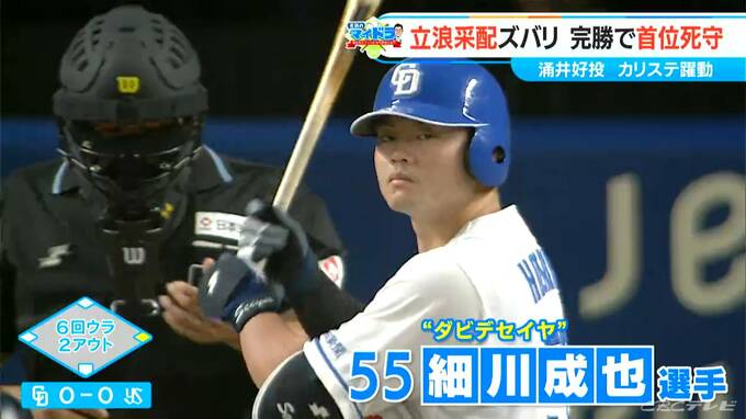0対0の6回、ツーアウト1塁で打席にはダビデセイヤ、細川選手。あと少しでホームランというフェンス直撃のツーベースで2塁3塁とチャンスを広げます。